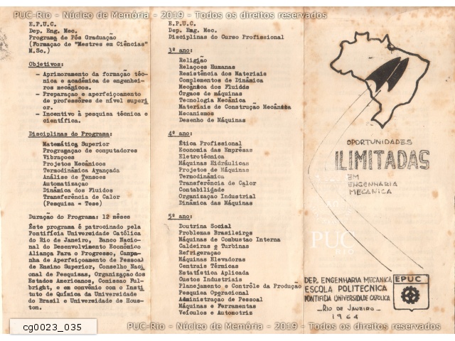 Folder com as "oportunidades ilimitadas" em Engenharia Mecânica da Escola Politécnica da PUC-Rio (frente). Objetivos e disciplinas da pós-graduação, patrocinado pelo BNDE, Aliança Para o Progresso, CAPES, CNPq, OEA, Comissão Fulbright, Instituto de Química da UFRJ e Universidade de Houston. Disciplinas do curso profissional. |