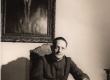 Pe. Viveiros em frente ao quadro com o Cristo crucificado. |