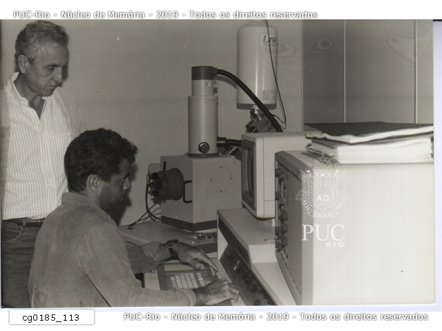 O diretor do Departamento de Ciências dos Materiais e Metalurgia, prof. José Carlos D'Abreu, com pesquisador no Laboratório de Metalurgia.