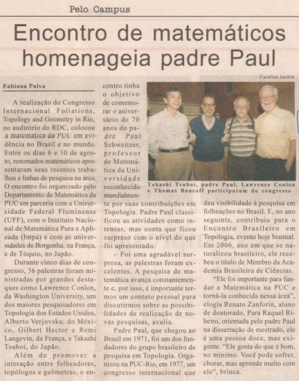 Durante o Congresso Internacional Foliations, Topology and Geometry in Rio, organizado pelo Departamento de Matemática da PUC-Rio entre os dias 06 e 10/08/2007, foi homenageado o Padre Paul Schweitzer S.J., um dos fundadores do grupo brasileiro de pesquisa em Topologia.