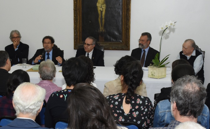 Na mesa, o Vice-Reitor Acadêmico Prof. José Ricardo Bergmann, o Prof. Júlio Diniz, o Reitor Prof. Pe. Josafá Carlos de Siqueira S.J., o Prof. Paulo Fernando Carneiro de Andrade e o Vice-Reitor Pe. Francisco Ivern S.J.. Fotógrafo Antônio Albuquerque. Acervo Núcleo de Memória.