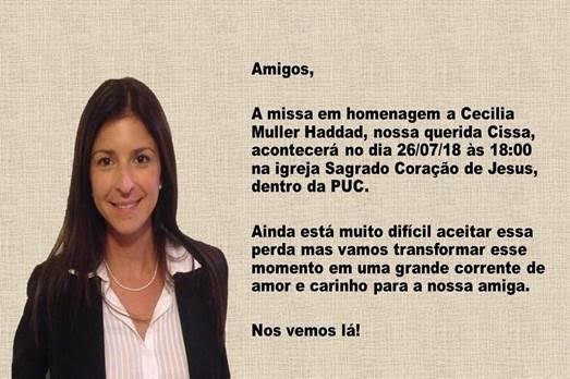 Com profundo sentimento convidamos a todos para a missa da nossa ex-aluna, Cecilia Muller Haddad, formada em 2003.
