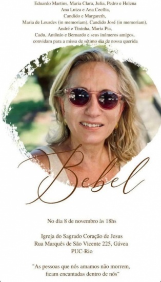 A missa de sétimo dia será no dia 08/11/2021, às 18h, na Igreja do Sagrado Coração de Jesus da PUC-Rio.
