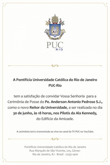 Em nome dos integrantes da Assessoria Jurídica da Reitoria, e em meu próprio, parabenizo o Pe. Anderson pela confirmação, desejando-lhe uma gestão profícua na liderança da Universidade. É motivo de tranquilidade e júbilo que a nossa PUC-Rio seja conduzida pela Companhia de Jesus, que expressa o firme caminho da qualidade acadêmica, acompanhada da tolerância.