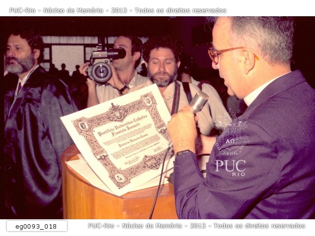 O prof. pe. Pedro Guimarães S.J. faz a leitura da concessão do título de Doutor Honoris Causa a dom Helder Camara. |