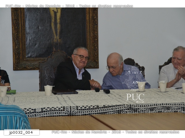 Reitor Pe. Josafá cumprimenta o ex-diretor do Departamento de Comunicação Social da PUC-Rio, professor Cesar Romero. |