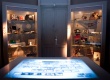 Sala Ícones da exposição PUC-Rio 70 Anos, Rumo aos 80 com a mesa interativa com fotografias e a estante com documentos, equipamentos e objetos dos departamentos do Centro Técnico Científico. |