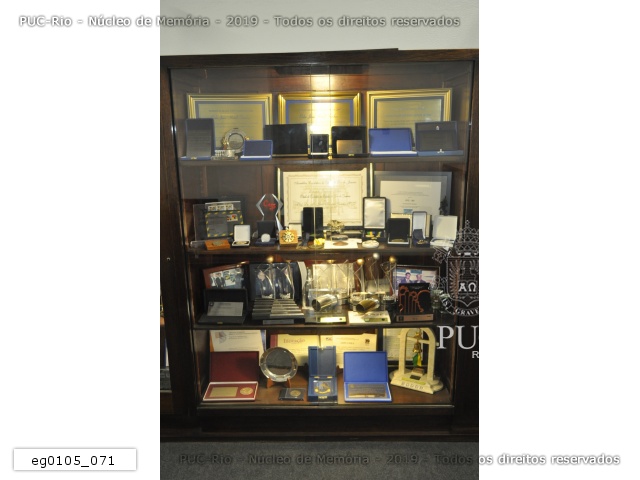 Medalhas, esculturas, diplomas e troféu do armário da sala de entrada da reitoria recebidos de instituições de ensino superior e empresas ou confeccionados pela PUC-Rio. |