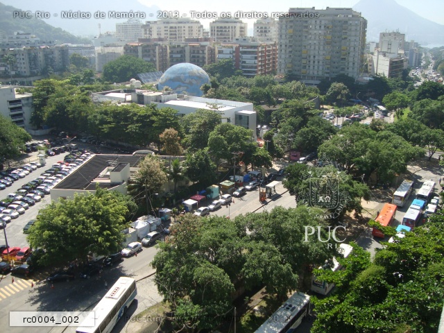 Imagem a partir do alto para o estacionamento principal. Vê-se o edifício do TecGraf, o Instituto Gênesis e o Planetário da Gávea. |
