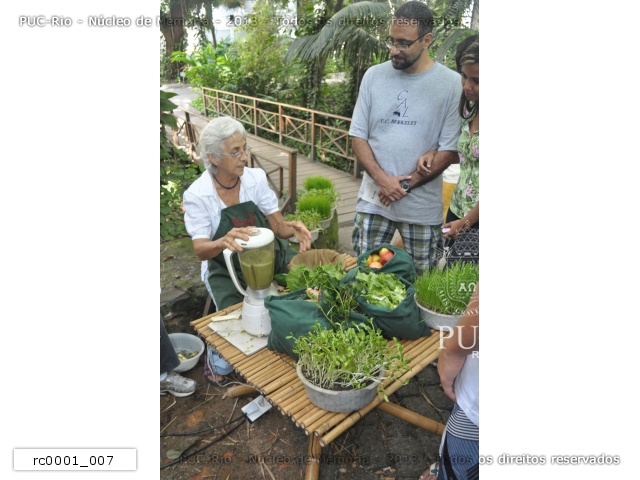 Professora Ana Branco observada enquanto bate alimentos no liquidificador. |