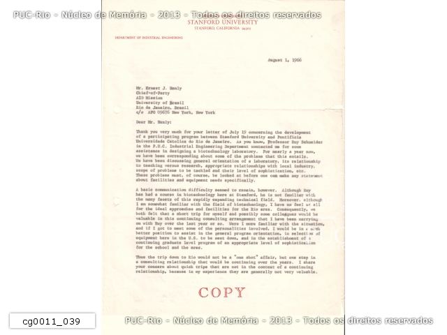 Correspondência de David A. Thompson (Stanford University) para Ernest J. Henly sobre uma colaboração entre a PUC-Rio e a Stanford University, com cópia para o prof. Ruy Schneider (IND). |
