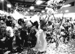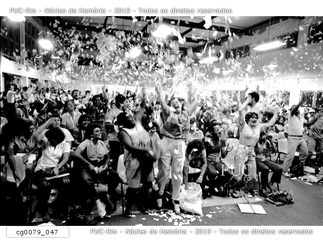 Assembleia de greve dos funcionários da PUC. Momento de comemoração, funcionários de mãos dadas e braços elevados. Papéis picados no chão. A greve chegou a ser decretada, mas negociações em dias posteriores levaram a um acordo e a greve foi cancelada. |
