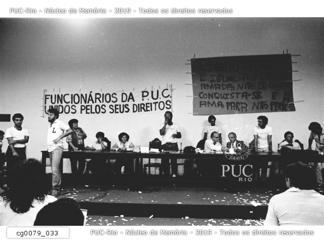 Mesa com representantes dos funcionários, com faixas ao fundo, por ocasião de uma assembleia de greve pelos funcionários da PUC-Rio. A greve chegou a ser decretada, mas negociações em dias posteriores levaram a um acordo e a greve foi cancelada. |