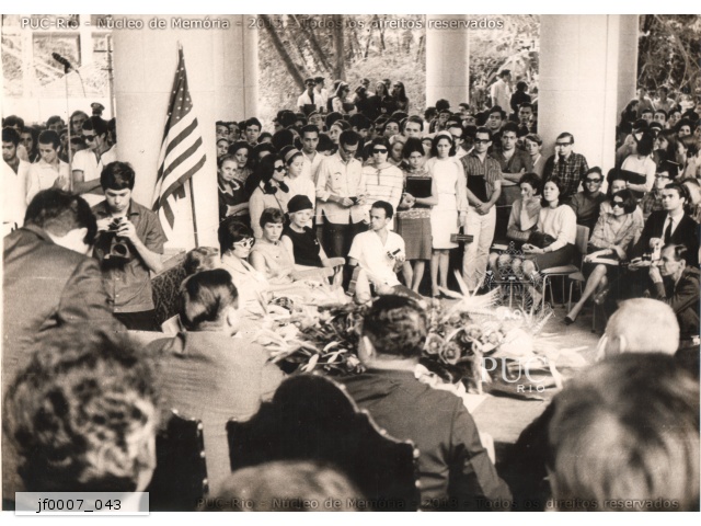 O senador Robert (Bob) Kennedy prepara-se para fazer um pronunciamento ao lado do reitor pe. Laércio S.J. antes da inauguração do busto de seu irmão, John Kennedy, nos pilotis do Edifício da Amizade. |