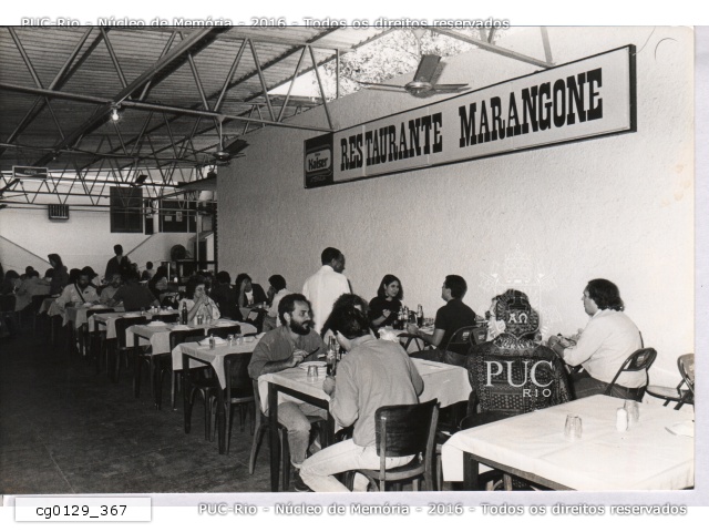 Almoço, talvez referente ao Dia do Reitor, nos pilotis do Edifício Cardeal Leme, na altura do bloco C, no qual há acima dos elevadores a placa comemorativa da inauguração do campus Gávea. |
