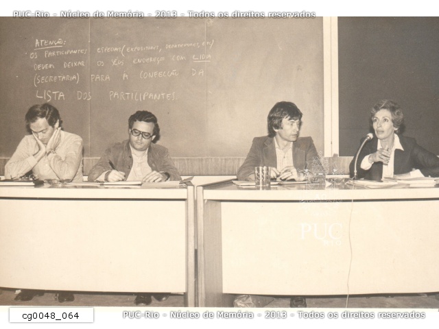 Os professores Antonio Edmilson, Margarida de Souza Neves e João Rua apresentam o Departamento de História e Geografia no Seminário Interno do CCS, realizado entre os dias 05 e 06 de setembro de 1979 no Centro de Estudos e Formação do Sumaré. O seminário, coordenado pela Vice-reitoria de Desenvolvimento, debateu a função da pesquisa, as fontes de financiamento e a relação ensino-pesquisa. O evento promoveu também a troca de informações e a integração entre os diretores e os professores dos departamentos constitutivos do CCS com objetivo de elaborar um Plano Diretor da PUC-Rio. |