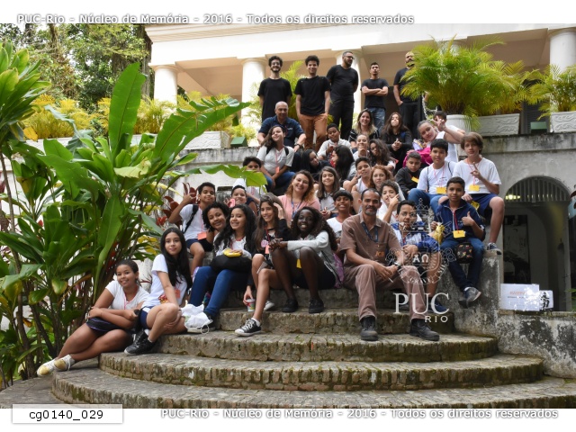 Visita de alunos da Escola Jockey Club Brasileiro, localizada na Gávea. Alunos, professores e auxiliares posam na escadaria do Solar. |