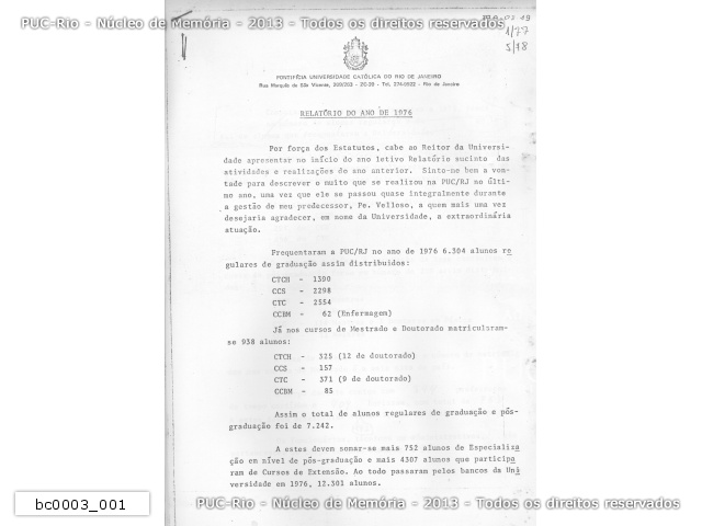 Relatório do Reitor da PUC-Rio de 1976, p.1. Totais de alunos matriculados, graduação, pós-graduação, especialização e extensão. |