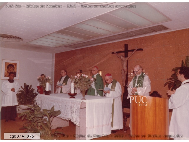 A criação do IAG, com fotografias de solenidades, com a presença de autoridades da PUC-Rio. |