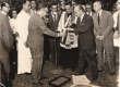 Pe. Alonso observa o Pe. Laércio cimentar simbolicamente a Pedra Fundamental da Concha Acústica. |