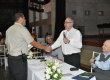 O professor Pedro Paulo Cristofaro recebe os cumprimentos do Reitor Padre Josafá S.J. em agradecimento aos 35 anos de dedicação à PUC-Rio. |