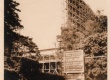 Obras do Edifício Central, depois Cardeal Leme. Vista a partir das frente de uma das casas remanescentes da vila que havia nos terrenos da PUC-Rio. Placa da construtora Severo e Villares, cujo engenheiro responsável era o prof. Carlos Alberto del Castillo. Dois homens perto do que seria o portão. |
