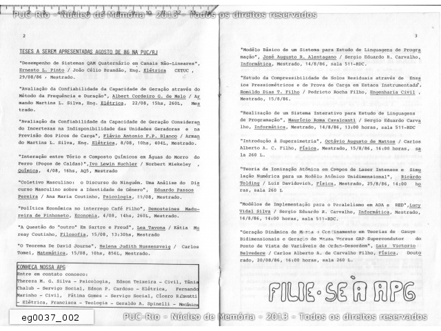 P.2 e 3 - Listagem das teses a serem apresentadas em agosto de 1986 na PUC-Rio. |