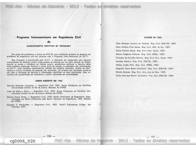 Páginas 106 e 107 do Catálogo Escolar do Centro Técnico Científico. Programa Interamericano em Engenharia Civil do MIT: corpo discente de 1965; alunos de 1966. |