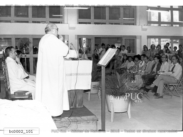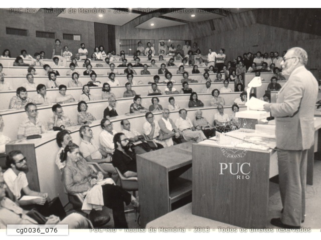 O Reitor Padre Mac Dowell S.J. diante dos docentes reunidos em assembleia sobre a demissão de professores. |