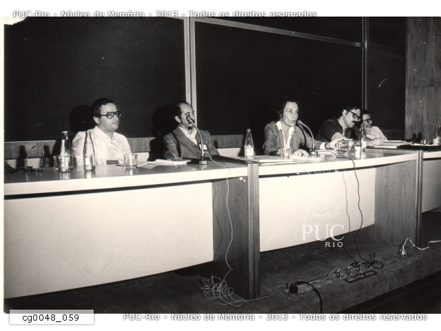 Os professores René Armand Dreifuss, Luiz Gonzaga de Souza Lima, Carlos Alberto Plastino e Mônica Hertz apresentam o Instituto de Relações Internacionais no Seminário Interno do CCS, realizado entre os dias 05 e 06 de setembro de 1979 no Centro de Estudos e Formação do Sumaré. O seminário, coordenado pela Vice-reitoria de Desenvolvimento, debateu a função da pesquisa, as fontes de financiamento e a relação ensino-pesquisa. O evento promoveu também a troca de informações e a integração entre os diretores e os professores dos departamentos constitutivos do CCS com objetivo de elaborar um Plano Diretor da PUC-Rio. |
