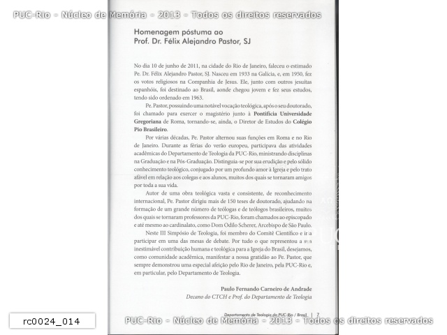 Texto de autoria do prof. Paulo Fernando Carneiro de Andrade em homenagem ao pe. Félix Alejandro Pastor S.J. |