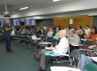 Professor Grumbrecht durante a aula e a plateia do curso. |