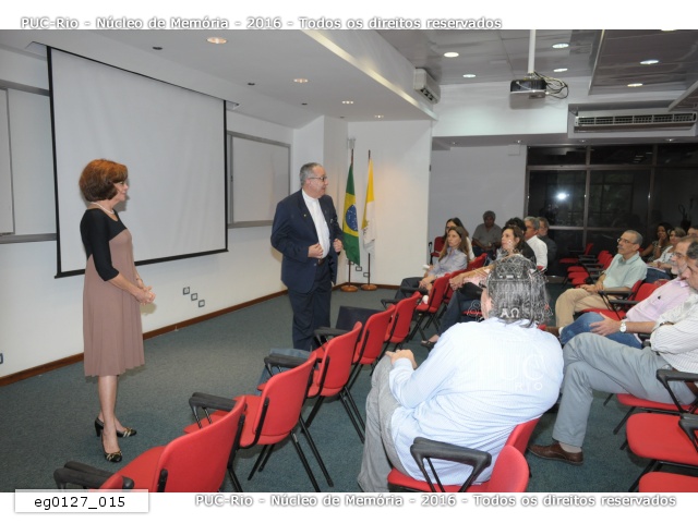 Representantes da administração central e outros professores da PUC-Rio aplaudem o Padre Ivern. |