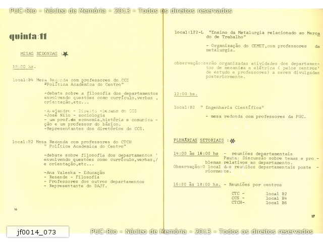 Páginas 16 e 17. Atividades de quinta-feira. Mesas-redondas e plenárias setoriais (CTC, CCS e CTCH), nos auditórios B2, B4 e B6. |