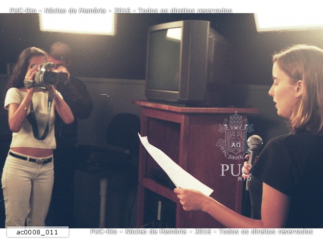 Estagiário da TV PUC na ilha de edição de imagem. |